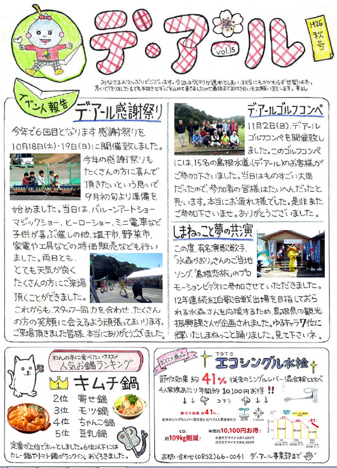 デ・アール感謝祭り、デ・アールゴルフコンペ、しまねっこと夢の共演、お店紹介ほか