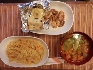 今回のメニューは  カレーピラフ・鶏の照り焼き・トマトスープ・バナナケーキでした。