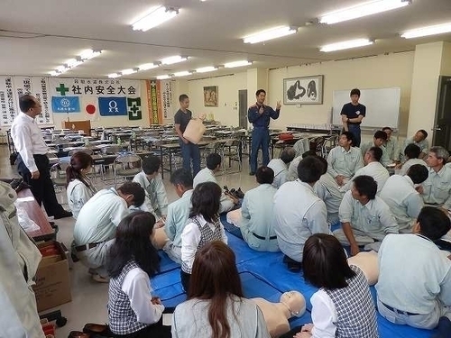 そして今回の安全大会では、松江消防署より3名の救命救急士の方に来ていただいて、救命講習を受けました。