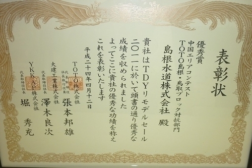 この度、TDYリモデルセール中国エリアコンテスト、TOTO島根・鳥取ブロック対抗部門におきまして優秀賞を受賞しました。