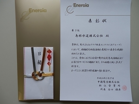平成24年2月27日(月)中国電力㈱にて表彰式がありました。