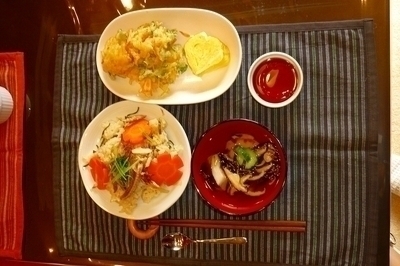本日のメニューは、秋刀魚ご飯・かき揚げ・焼きはんぺんのすまし汁・だし巻き玉子・紅茶ゼリーでした。