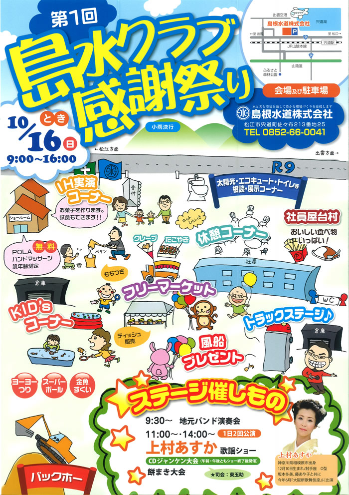 会場には特設ステージを設け、上村あすが歌謡ショー、餅まき大会、ご家族でお楽しみいただけるキッズコーナー、フリーマーケット、社員屋台村など、たくさんの催し物を準備して、社員一同皆様にお会いするのを楽しみにしております。