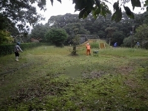 草刈機部隊と、収集部隊との連携プレーで、高く伸びた草、遊具の周りにびっしりと生えた草を一つ残らず刈ることができました。